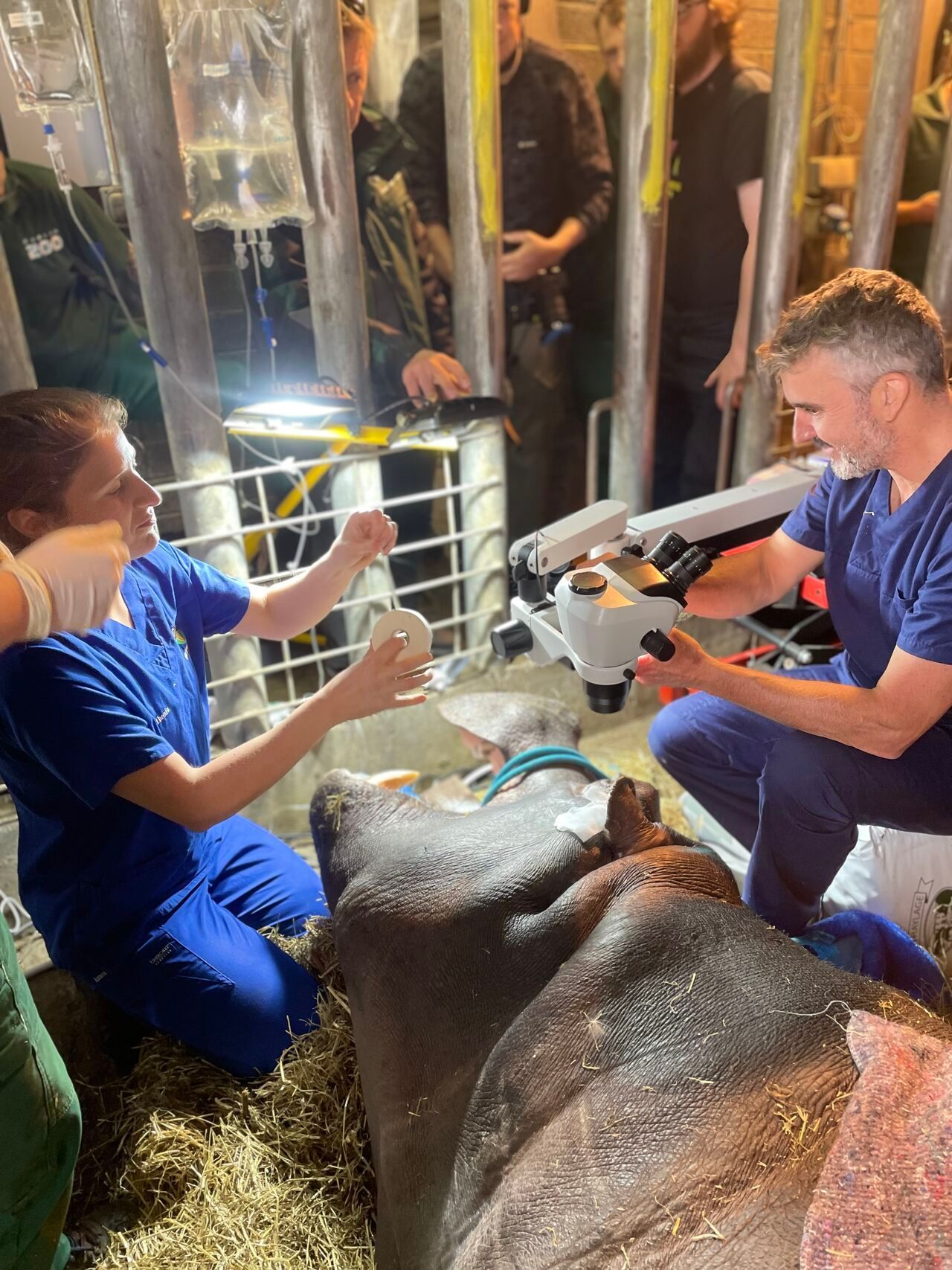 FauneVet is pleased to announce a major first: the successful completion of a cataract operation on one of Dublin Zoo’s common hippopotamuses. 🦛🦛 This extraordinary procedure was made possible thanks to the close collaboration between the Dublin Zoo teams (veterinarians and keepers) and FauneVet for the anaesthesia, as well as Laurent Dillie (IO Vet) for the ophthalmological examination and surgery.